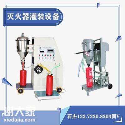 灭火器维修设备公开了一种灭火器灌装上下料装置,包括干粉灌装箱体和设在干粉灌装箱体内用于灌装干粉的干粉灌装嘴和用于对灭火器筒体内干粉打孔的打孔杆,所述干粉灌装箱体的相对两侧均设有侧门,对应侧门设有可打开的侧门板,所述干粉灌装箱体内设有用于输送并称重的称重输送皮带,称重输送皮带的端部对应侧门设置。该灭火器灌装上下料装置结构设计合理,通过上料推动缸、称重输送皮带以及下料输送皮带自动完成灭火器筒体上下料操作,并且通过称重输送皮带可对灌装干粉重量进行检测,以及通过控制侧门板开合,可实现在密闭的箱体内实现灌装,改善灌装车间空气环境。